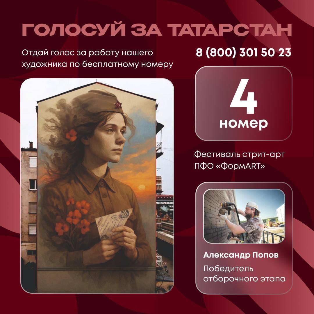 Республику Татарстан представляет художник Александр Попов с муралом «Ждёт». Александр создал свой мурал в городе Зеленодольске на торце по улице Комарова, 13. Номер для голосования за мурал «Ждёт» Александра Попова — это цифра 4.